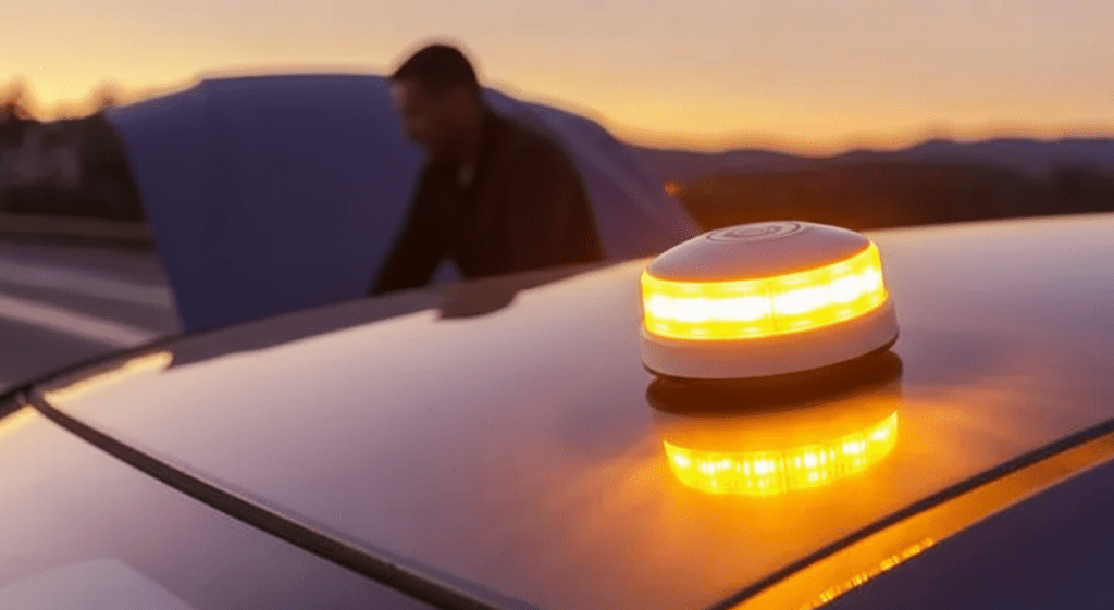 La señal V16 es un dispositivo luminoso que se coloca en el techo del coche para alertar al resto de conductores en caso de emergencia. Su gran diferencia respecto a los triángulos y principal ventaja es que no es necesario salir del vehículo para señalizar una avería y colocarla, lo que reduce notablemente la exposición al tráfico y, por tanto, el riesgo.